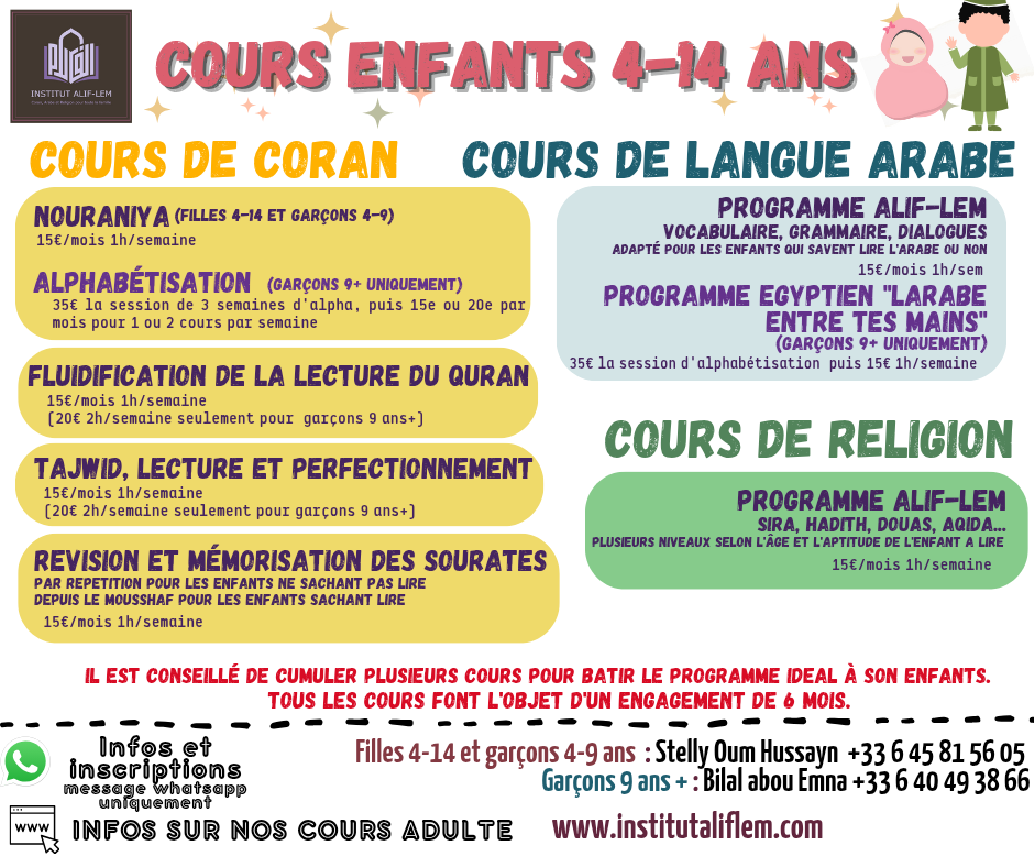 Conditions : Savoir déchiffrer l’arabe. 1 cours de 1h/semaine, 15€ par mois. (possibilité pour les ados garçons 2 cours de 1h/semaine, 20€ par mois.) Engagement 6 mois.